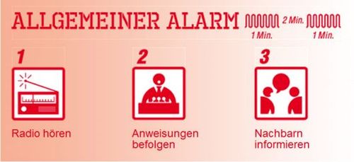 Verhalten beim allgemeinen Sirenenalarm in der Schweiz. | http://www.bevoelkerungsschutz.admin.ch/internet/bs/de/home/themen/alarmierung/alarmierungszeichen.html | Swiss Federal Office for Civil Protection (FOCP) | Datei:BABS - Allgemeiner Alarm.jpg | |