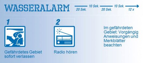 Verhalten beim Wasseralarm in der Schweiz. | http://www.bevoelkerungsschutz.admin.ch/internet/bs/de/home/themen/alarmierung/alarmierungszeichen.html | Swiss Federal Office for Civil Protection (FOCP) | Datei:BABS - Wasseralarm.jpg | |