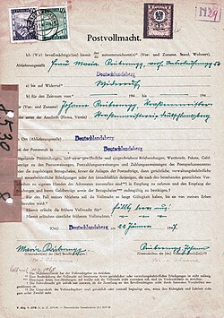 | Postvollmacht des Postamtes Deutschlandsberg für einen Mitarbeiter der Straßenmeisterei | altes Formular der österreichischen Post- und Telegrafenverwaltung, für die Datei (Verschmutzung entfernt): Eigenes Werk | unbekannt, amtliches Werk, für die Datei: Josef Moser | Datei:Postvollmacht Straßenmeisterei Deutschlandsberg 1947 Vorderseite.jpg | |