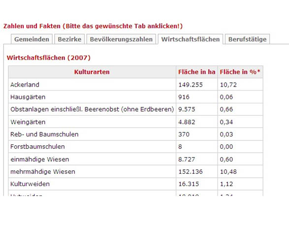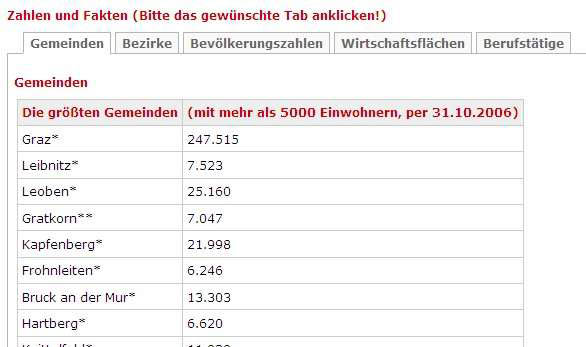 Die Strukurierung von Information und die Navigation in Daten kann durch sogenannte "Tabs" erleichtert werden. Abbildung 2 zeigt den Ausschnitt aus einer Tabelle über die Steiermark http://austria-forum.org/af/AEIOU/Steiermark, wobei das erste der 5 "Tabs" geöffnet ist - die Gemeinden.