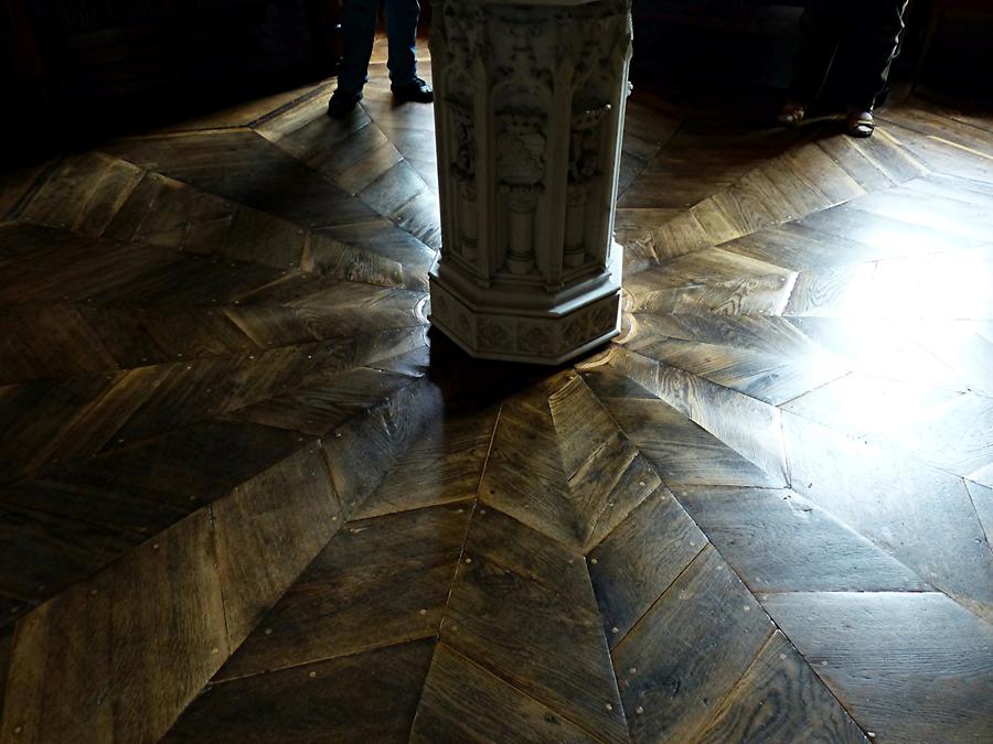 Bibliothek: Der Fußboden ist aus Mooreiche, d.h. er kann bis zu 8.500 Jahre alt sein, weil die Eiche in einem Moor gelegen war.
