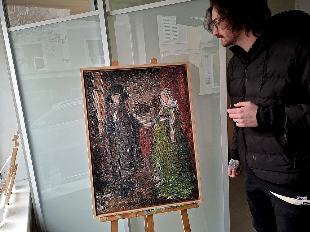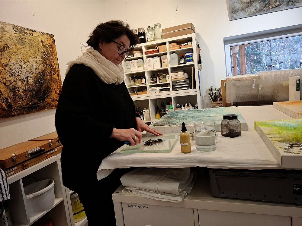 Ich erwähne das so detailliert, weil dem im Analogen quasi Malerin Martina Brandl gegenübersteht. Sie ist im Herstellen und Verarbeiten von Farbpigmenten sehr versiert, was technisch auf den eingangs erwähnten Beginn der Malerei verweist, also auf den Anfang von Bildtechniken.