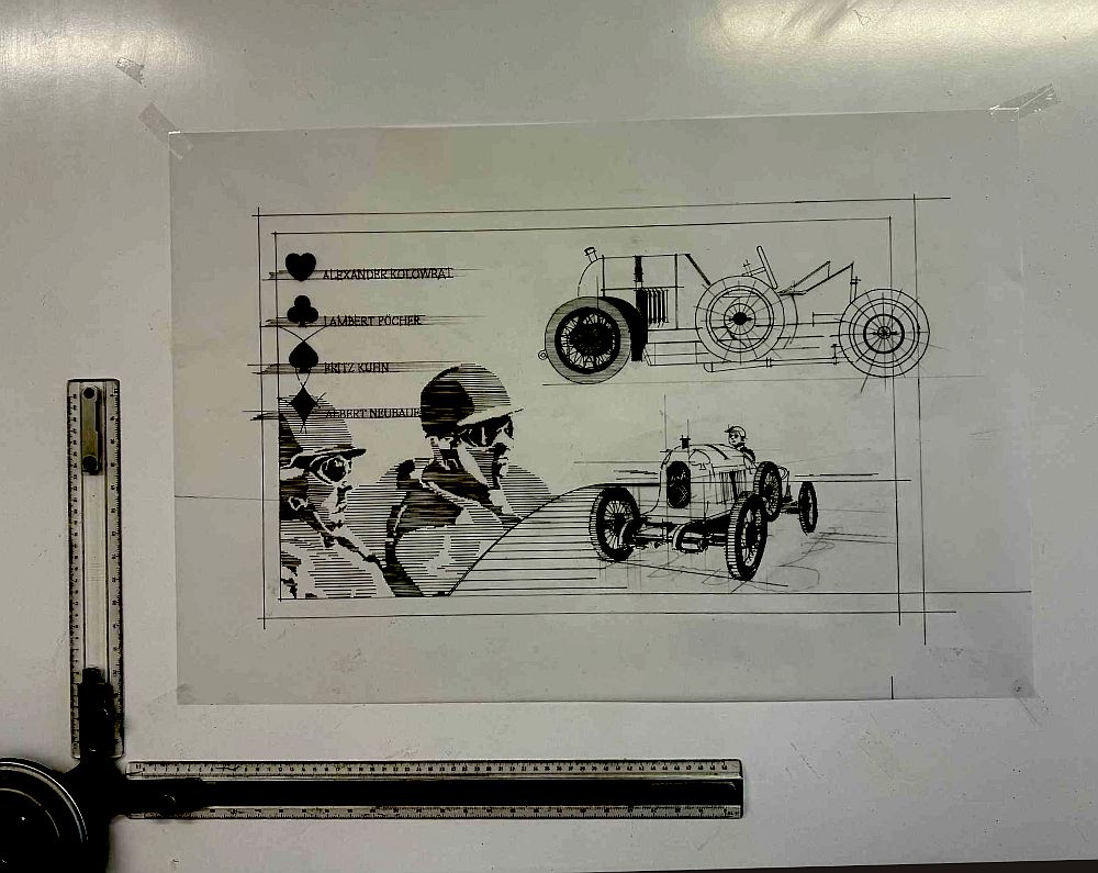 Dämmert Ihnen etwas? Jetzt ist aktuell noch Joachim Karner zu erwähnen, der einerseits gerade an seinen Beiträgen für das Booklet „Mini Fabula“ arbeitet. Andrerseits hat er eben einen weiteren Meilenstein europäischer Technik- und Automobilgeschichte gezeichnet. Nachdem Karner für unser „Mythos Puch Nr. 10“ eine beeindruckende Grafik mit dem „Blitzen-Benz“ vorgelegt hatte, widmete er sich nun dem Austro-Daimler ADS R, genannt „Sascha“. (Eine wegweisende Porsche-Konstruktion.)