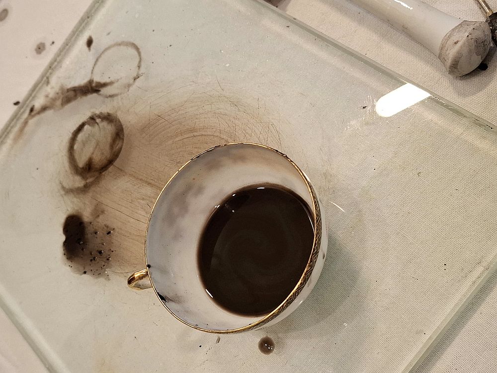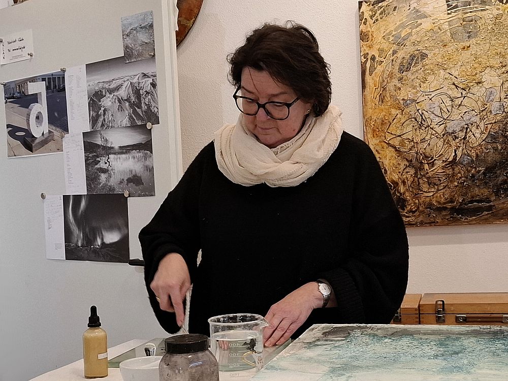 Am 8. Mai 2026 kann man das alles in der Ausstellung „artgerecht“ zusammengefaßt finden. Das hat auch seine Momente in den virtuellen Räumen der Künstlichen Intelligenz, ist aber vor allem sehr physisch. Wie etwa die Pigmente, mit denen Martina Brandl arbeitet, um zu tauglichen Farben zu kommen. Eine ganz ursprüngliche Art, denn die längste Zeit gab es für die Malerei keine Tuben aus dem Farbgeschäft zu kaufen. Man mischte seine Farben selbst. Vor dem Mischen müssen die Pigmente in Wasser „angeteigt“ werden. Brandl erläuterte uns ihre Verfahrensweise, mit der Arbeiten entstehen, wie sie dann auch bei der erwähnten Ausstellung zu sehen sein werden.