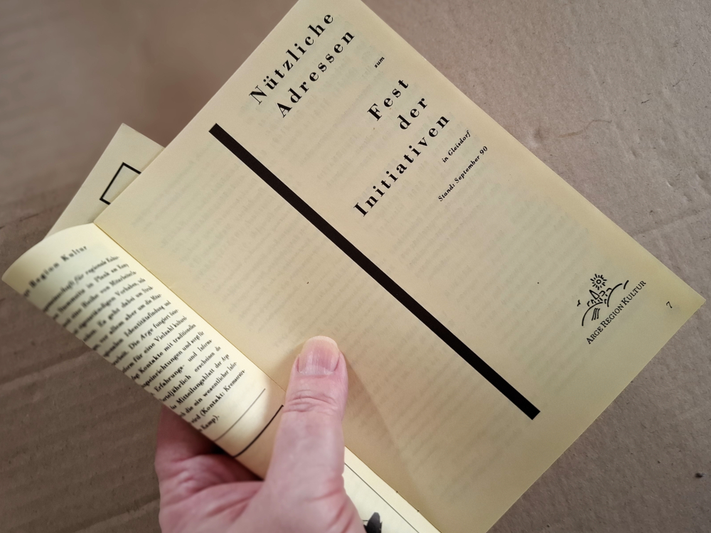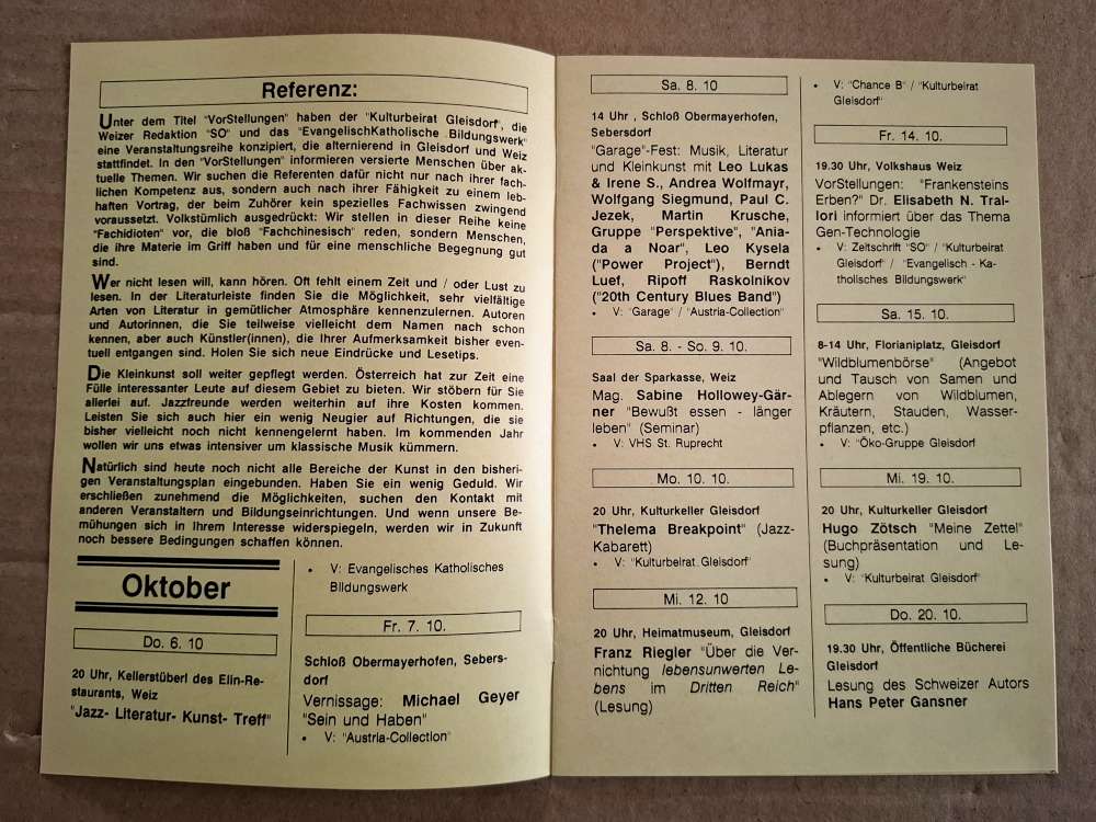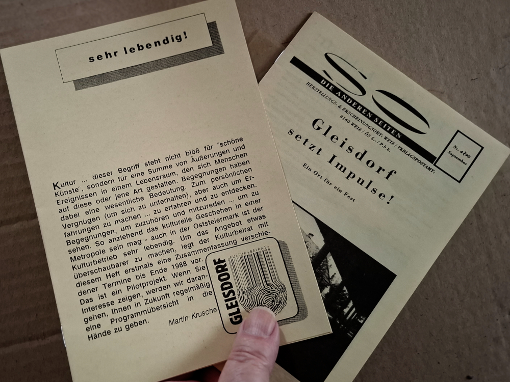 Da wir es nicht haben, obwohl alle Mittel dafür auch ganz ohne staatliche Finanzierung greifbar sind, schließe ich, daß sich jene, die sich als „Szene“ darstellen, sowas eigentlich nicht wollen. Sie möchten sich nicht aus eigener Kraft aktiv vernetzen, dafür die Verantwortung übernehmen, würden es aber begrüßen, wenn ihnen der Staat so eine Arbeit abnähme.Wie komme ich darauf? Ich habe mich in der zweiten Hälfte der 1980er als Teil des Gleisdorfer Kulturbeirates engagiert. Dabei ging im Oktober 1988 mein Pilotprojekt über die Bühne. Ein gemeinsames Programmheft der Städte Gleisdorf und Weiz als Ausdruck eines Kooperationspotentials. (Es blieb bei diesem einen Booklet.)