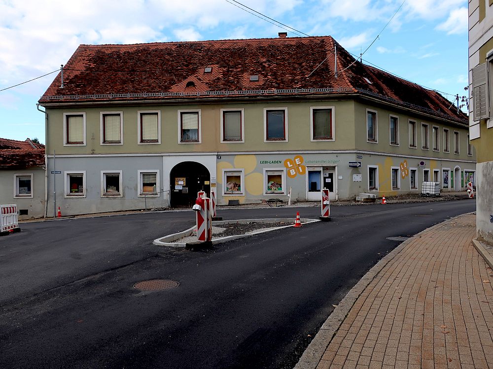 Von dort muß kürzlich ein etwas unkonzentrierter Mensch dahergekommen sein. Vor dem Rathaus runter… Beim Riedlhaus treffen sich die Route von Feldbach (Franz Josef-Straße) und ein Teil des Einbahnrings (Schillerstraße). Es braucht daher einige Entschlossenheit, vom Rathaus nach links und gegen die Einbahn einzubiegen, um dann rechts – weiter gegen die Einbahn – in die Schillerstraße zu fahren. (Soweit ich sehen konnte, kamen bei der Begegnung alle heil davon.)
