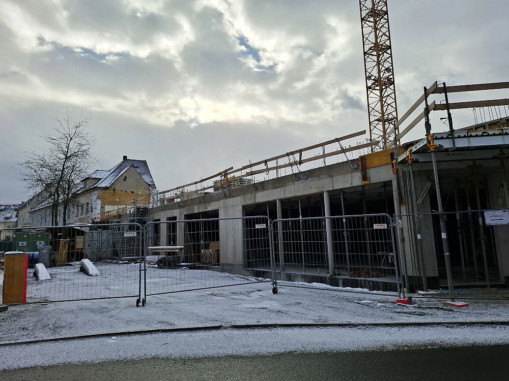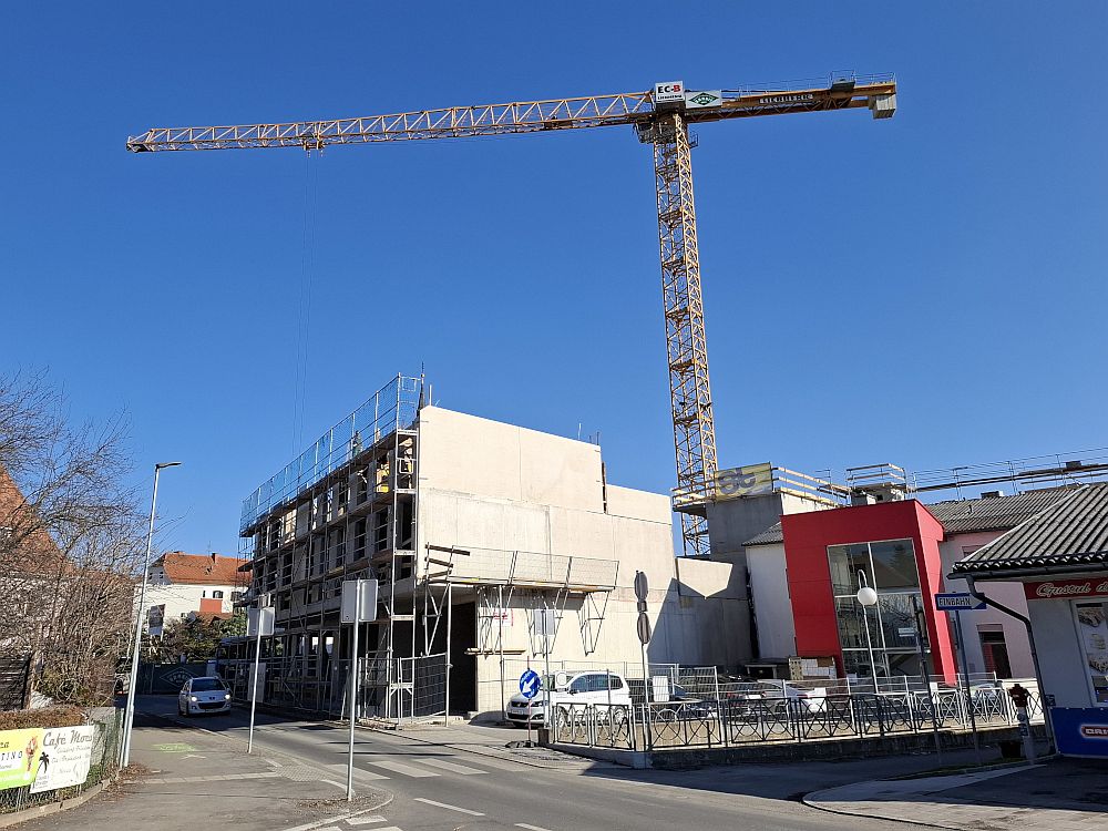 von Martin KruscheAn das Blatt „Die Baustelle III“ anknüpfend, denn dort sieht man noch den Altbau, der im März 2025 abgerissen wurde, eine kleine Schleife. Dort die Baugrube von August und September 2025, im November eine erste Wand auf dieser Seite zur Ludwig Binder-Straße hin. Im gleichen Monat war dann das Gebäude erkennbar. Das Winterfoto bei „Die Baustelle III“ stammt vom 6. Jänner 2026. Dem stelle ich hier nun ein Foto vom 5. März 2026 voran. Da ist das Gebäude inzwischen ein Stockwerk höher.