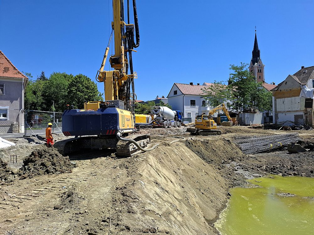 Darunter noch vier frühere Motive. Vom Altbau zum Abriß, neben dem eine weiträumige Baugrube ausgehoben wurde, an deren Ränder jene zylindrischen Löcher gebohrt wurden, in die Armierungsstahl kam (Bewehrungskörbe), um diese Löcher dann mit Beton auszugießen. Das ergab erstens eine Absicherung der Grubenwände (Bohrpfahlwand) und ist zweitens Teil der Fundamente.