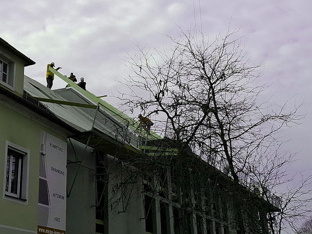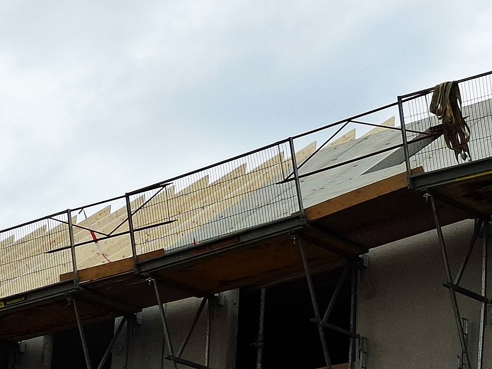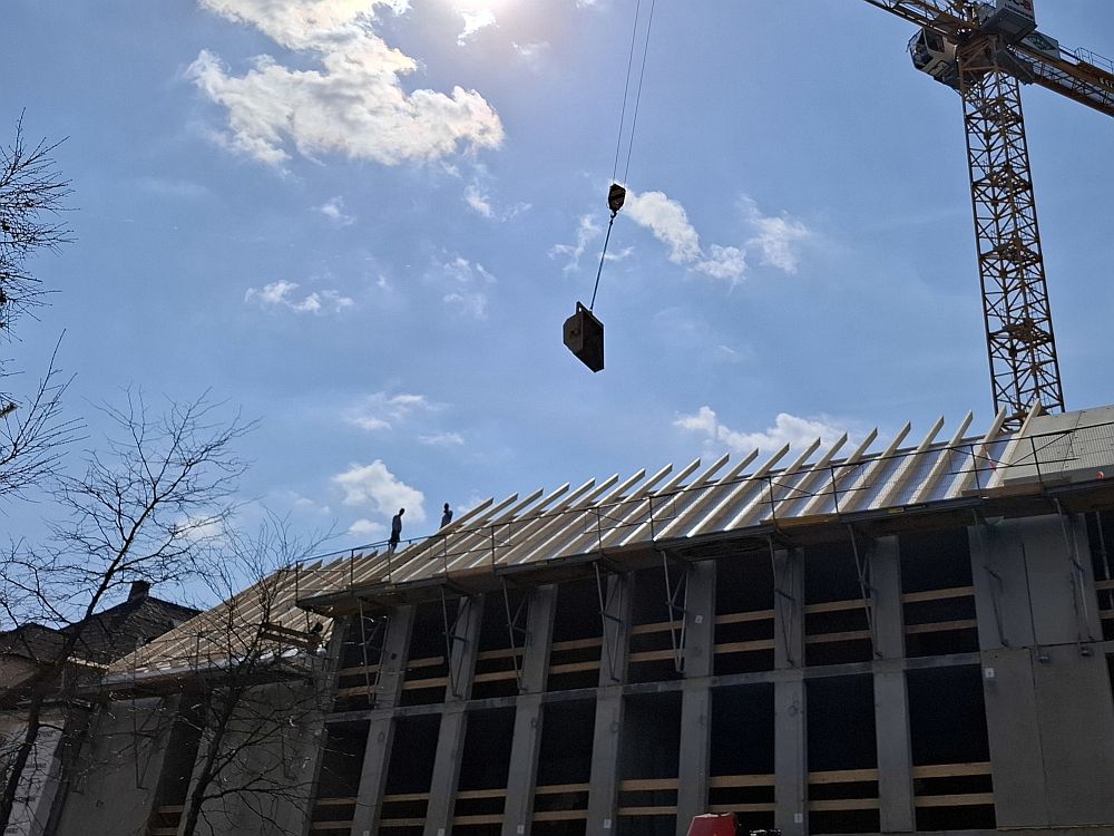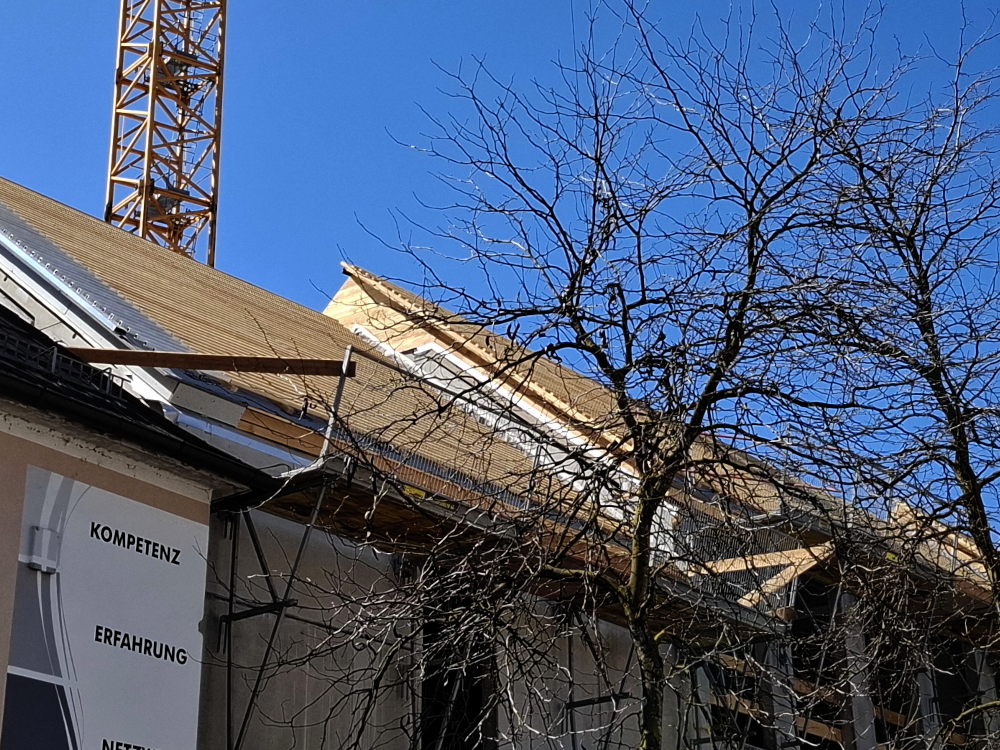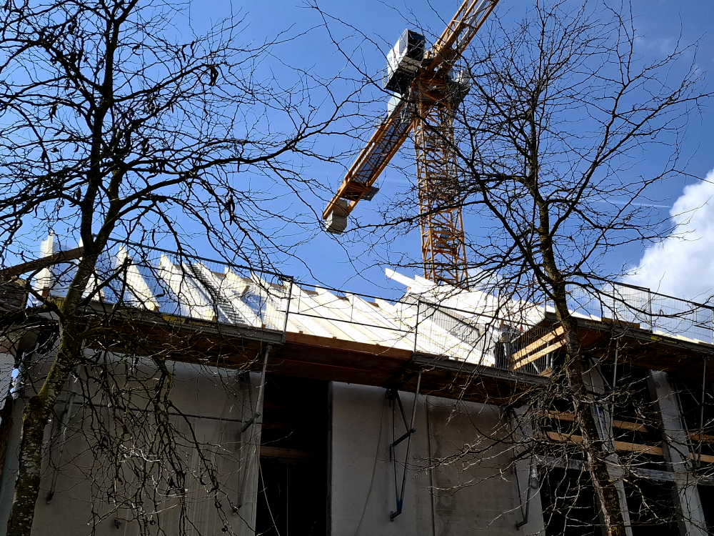 Schließlich wurde eine Dachlandschaft draufgesetzt. Und wie ich schließlich sehen konnte, dazu kam letztlich eine Art eigenständiger Dorfplatz auf dem Dach, von Bauten umgeben, auf denen der Dachstuhl ruht.