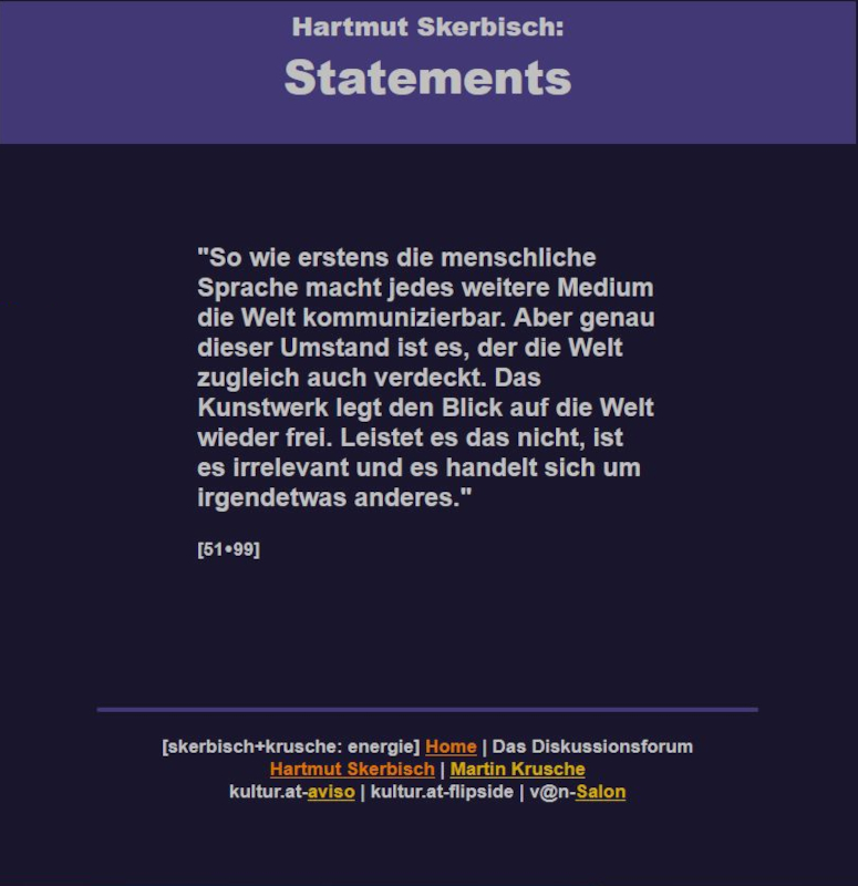Im Jahr 2018 hatte ich mein Projekt „Praxiszone Dorf 4.0“ (Kunst, Wirtschaft und Wissenschaft) in Gang. Dazu gehört die „Notiz 011: Im Raum bestehen“. Darin ist notiert: „Aus Gesprächen mit Hartmut Skerbisch hab ich die Anforderung in Erinnerung, ein Werk müsse ‚im Raum bestehen‘. Das wurde für mich zu einem sehr schönen Prinzip, das mir in meinem Rückblick auch als Skerbisch-Aussage ‚Der Satz muß im Raum bestehen‘ erinnerlich ist. (Ich vermute, an Skerbisch wurde oft unterschätzt, wie wichtig ihm Nuancen waren.)“