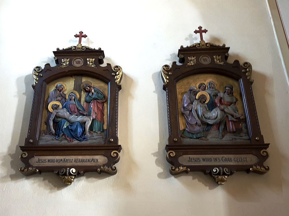 Die 14. Station des Kreuzweges handelt von der Grablegung Jesu. Im Evangelium nach Matthäus lautet die betreffende Stelle 27,61: „Auch Maria aus Magdala und die andere Maria waren dort; sie saßen dem Grab gegenüber.“ Das ist eine auffallende Betonung des Ranges zweier Frauen in dieser Geschichte. Die Mutter Jesu steht dabei in ihrer Rolle außer Diskussion.