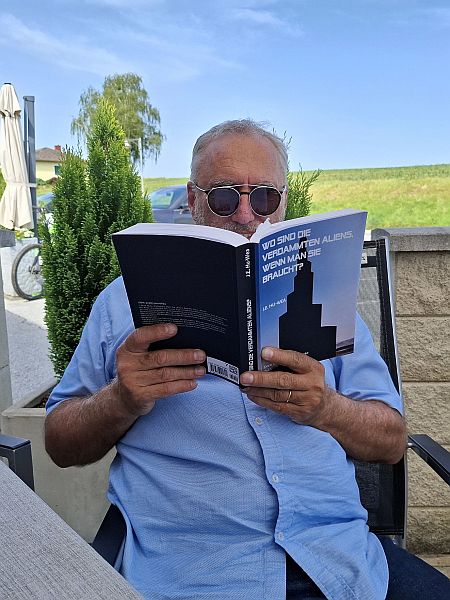 Zu diesem Set ist ein kleiner Triptychon arrangiert worden. Der zeigt von links: Jürgen Kapeller a) als KI-Produkt, b) als Autor und c) in der vormaligen k.k. Poststation von Gleisdorf.