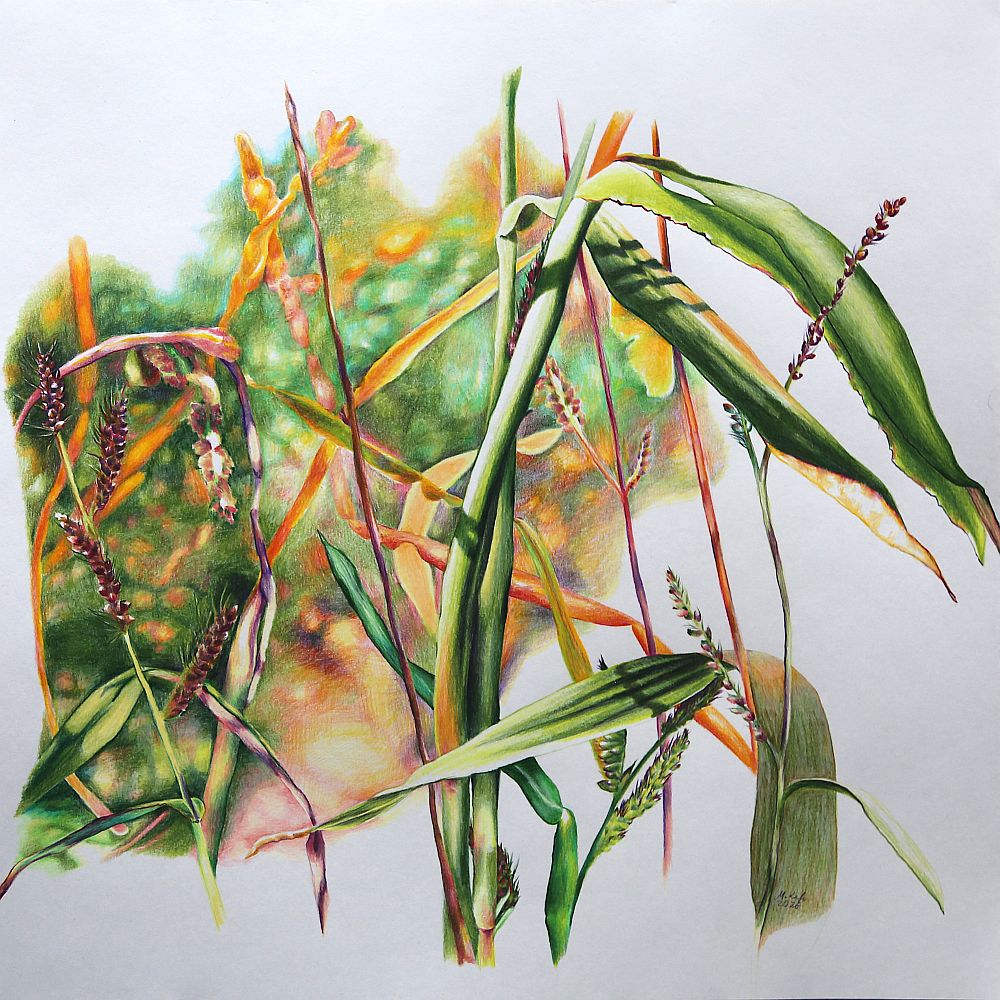 Die Fotovorlage dient als Anhaltspunkt – keinesfalls ist es das Ziel, sie nachzuahmen. Die Komposition der Gräser wird mittlerweile freihand übertragen – kein Projektor, Beamer oder Raster.