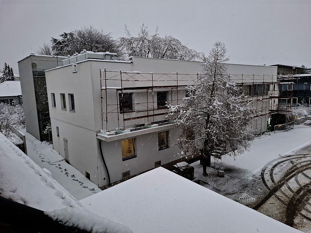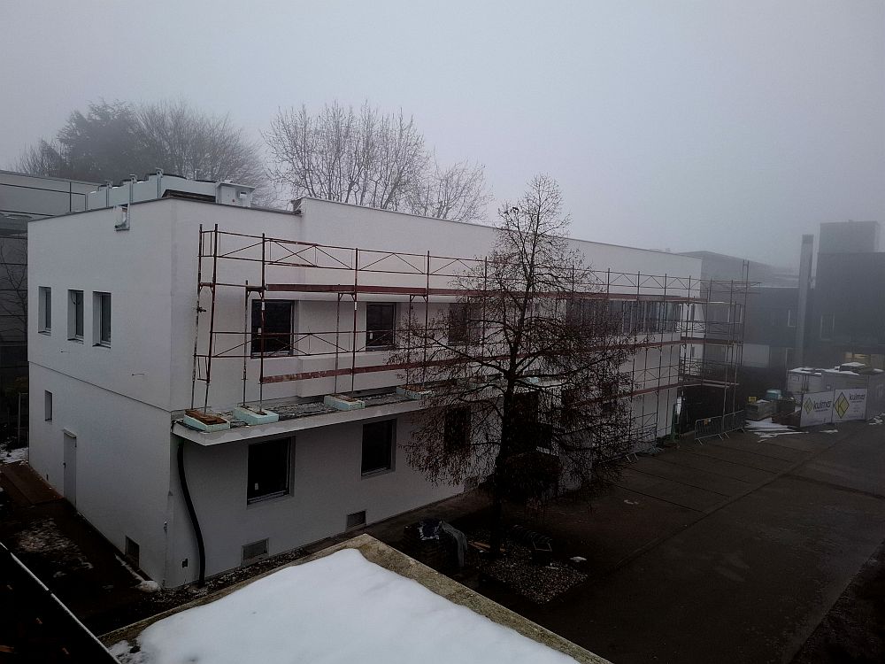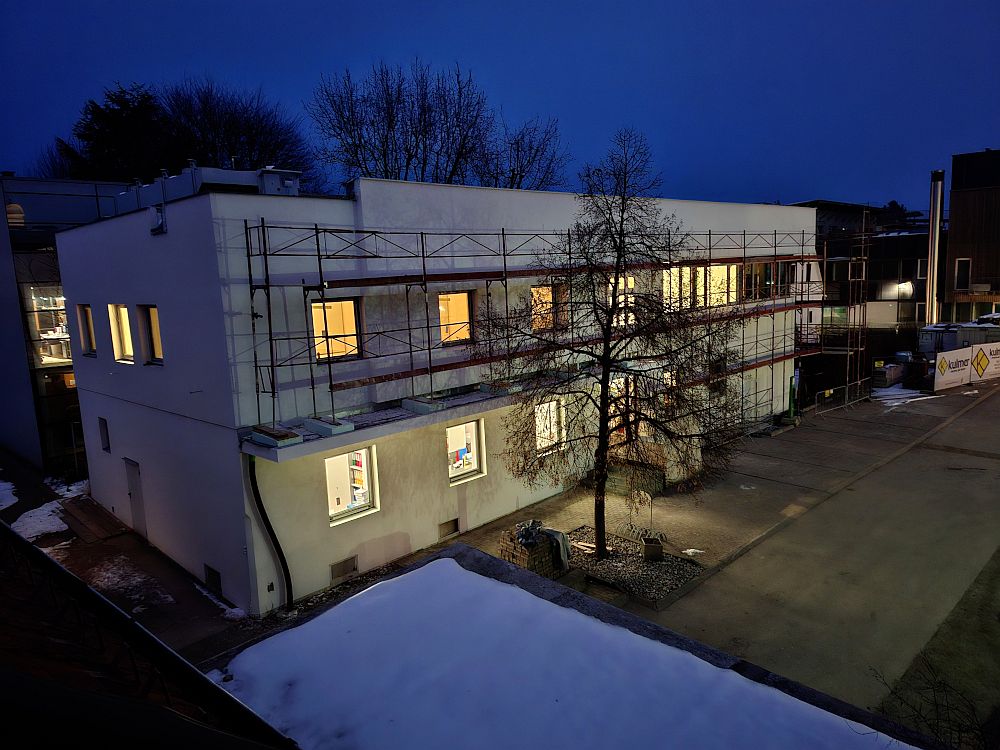 Der Bereich liegt direkt unter meinen Bürofenster, weshalb ich diesen markanten Prozeß gut verfolgen konnte. Im Jänner 2026 kam die Baustelle zur Ruhe. In der zweiten Jännerhälfte fielen mir morgens erstmals die beleuchteten Fenster auf, was darauf schließen ließ, daß dort der Betrieb wieder aufgenommen wurde. Vom Hausherrn erfuhr ich allerdings, daß im Haus während der Bauarbeiten keineswegs die Kanzlei stillgestanden hatte.