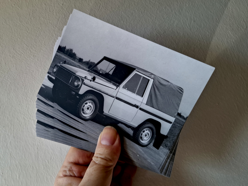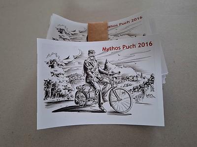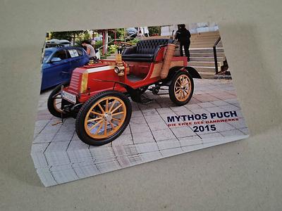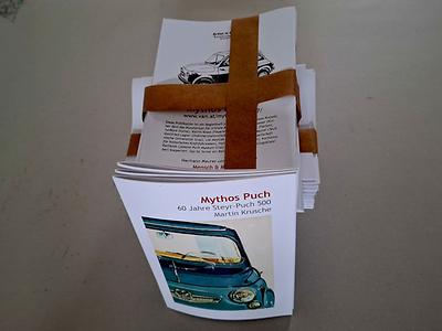 Oder die Postkarte mit dem Puch-Schammerl von WIGL-Design. Daneben noch ein Rest der Postkarten mit dem Albl Phönix von 1902, dem älteste fahrbereiten Auto aus steirischer Produktion. Auch das gedruckte Booklet zu „60 Jahre Steyr-Puch 500“, dessen Online-Version Sie unten bei den Links finden.