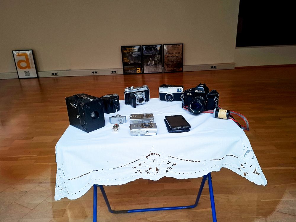 Zum Beispiel mit einer Schau historischer Kameras, auf dem Zeitpfeil angeordnet, zur Frage: „Wie kam die Fotografie in die Oststeiermark“? Mit diesem Prozeß sind wir augenblicklich Gäste in einem Haus der Familie Wesonig: Weizer Straße 4, neben dem Eissalon „Reina“.