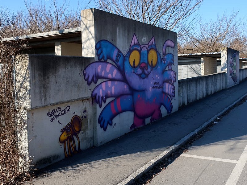 Dort finden Sie an den Betonwänden einige markante Bilder. Nicht gerade herkömmliches Graffiti, denn diese Arbeiten wurde in organisierter Form herbeigeführt, sind also eher Wandmalerei. Von da kommen sie stadtauswärts über die Feldgasse auf eine gesperrte Forststraße. Dabei findet man unterwegs einen jungen Bau mit neuem Ziegelgitter. Diese dekorative Form, dem Gebäude eine Belüftung zu verschaffen, ist also nicht aus der Mode gekommen. Im Weitergehen werden Sie eine landschaftlich Kuriosität entdecken. Eine großflächige Solaranlage.
