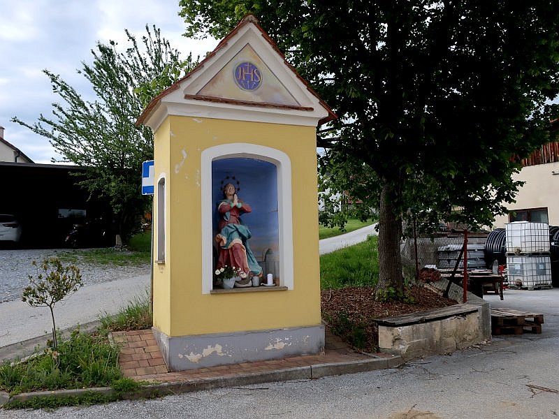 Den Hohenberg hinauf, hier war ich auf einer anderen Runde schon einmal: Schnittstelle, nach einer Weile finden Sie das Feichterkreuz von Gamling. Ein stattlicher Breitpfeiler, üppig ausgestattet, dessen Renovierung noch nicht lange genug zurückliegt, als daß ihm das Wetter etwas hätte anhaben können.