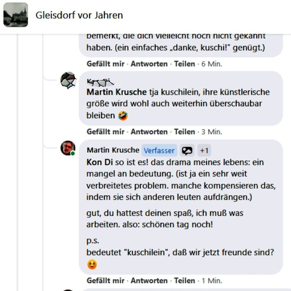 - kru: „so ist es! das drama meines lebens: ein mangel an bedeutung. (ist ja ein sehr weit verbreitetes problem. manche kompensieren das, indem sie sich anderen leuten aufdrängen.) gut, du hattest deinen spaß, ich muß was arbeiten. also: schönen tag noch! p.s. bedeutet ‚kuschilein‘, daß wir jetzt freunde sind?“