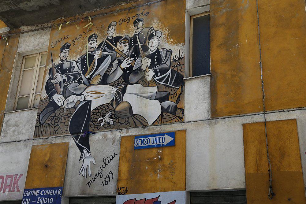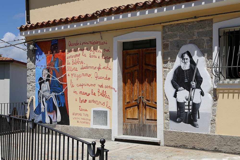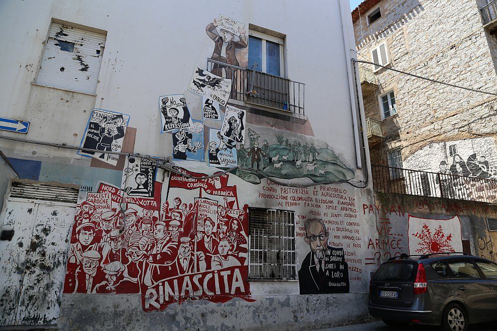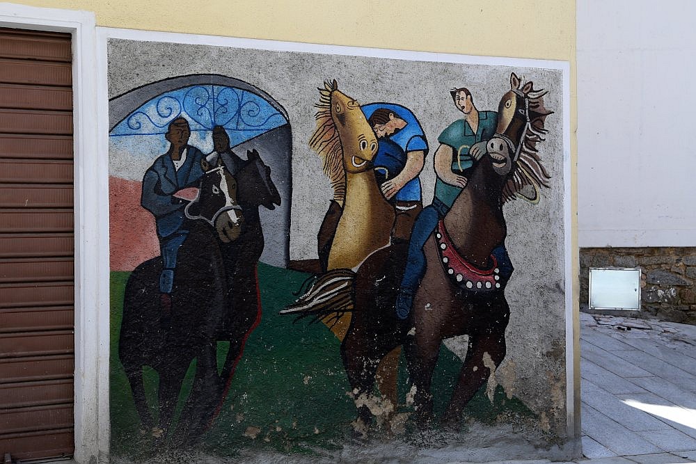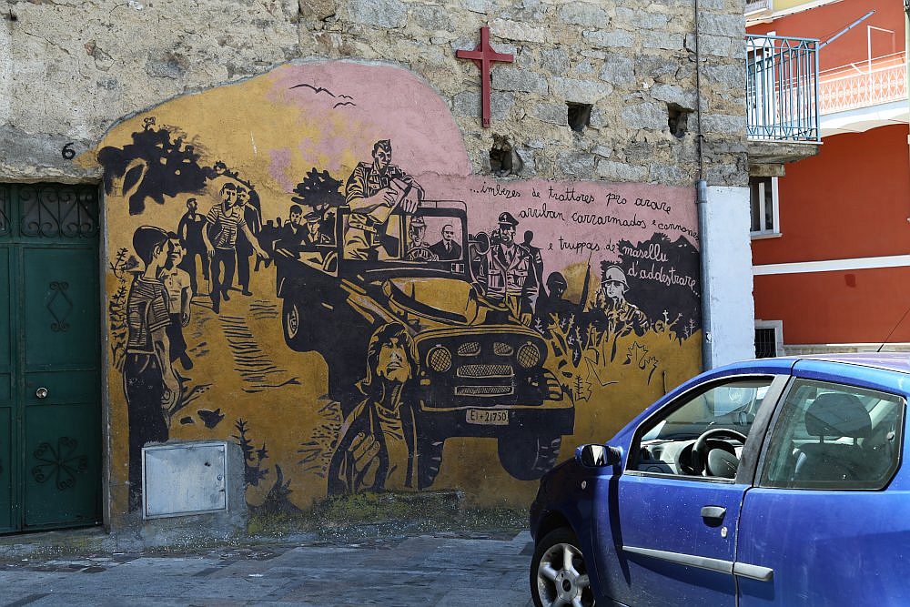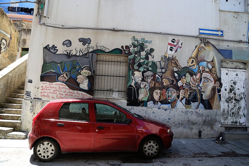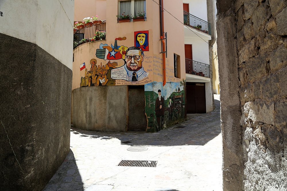 von Monika LaferDie Außenhaut der Innenstadt, die Wände der Dörfer, die Zeichen und Wegmarken… Solveig Grothe notierte 2016 unter dem Titel „Killer und Künstler“ etwa: „Die Bewohner von Orgosolo legen sich mit jedem an - auch mit Staat und Militär. Die kriminelle Geschichte des Städtchens auf Sardinien ist so eindrucksvoll wie die politische Wandkunst.“ Das hat eine verwegene Geschichte und hatte bezüglich der „Murals“ mehrere Auslöser. Einer davon die „Revolte von Pratobello“. Dazu heißt es: „Sie sollte Orgosolo endgültig zum Mythos des sardischen Widerstands gegen den als Kolonialmacht beargwöhnten italienischen Staat machen.“ (Quelle) Die Fotos dieses Albumblattes stammen von einer Reise im Jahr 2013.