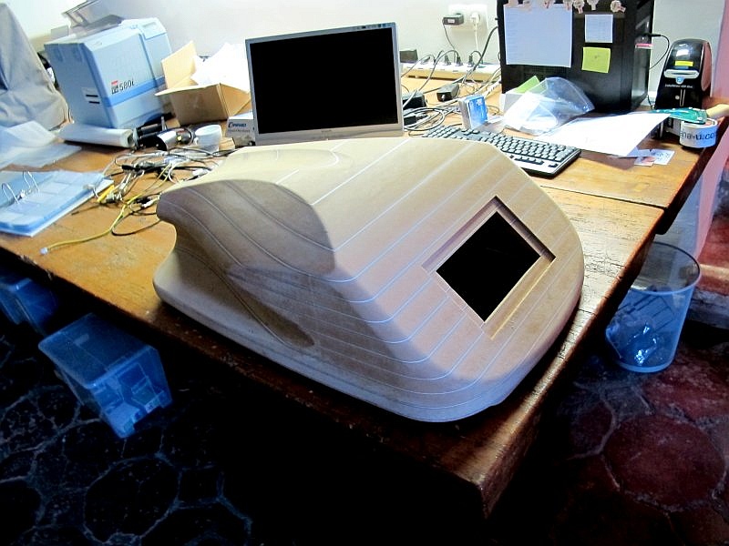 In der Folge dieser Iteration und in Abstimmung mit der Technik-Ausstattung (von Ana-u), die im Basis-Häusel der Fiat 500-Miniatur Platz finden mußte, entstand statt einer simplen Abdeckung des Artefaktes „Fiat lux“ dieser spezielle „WiGL-Kopf“, der aus einem Holzblock gefräst wurde.