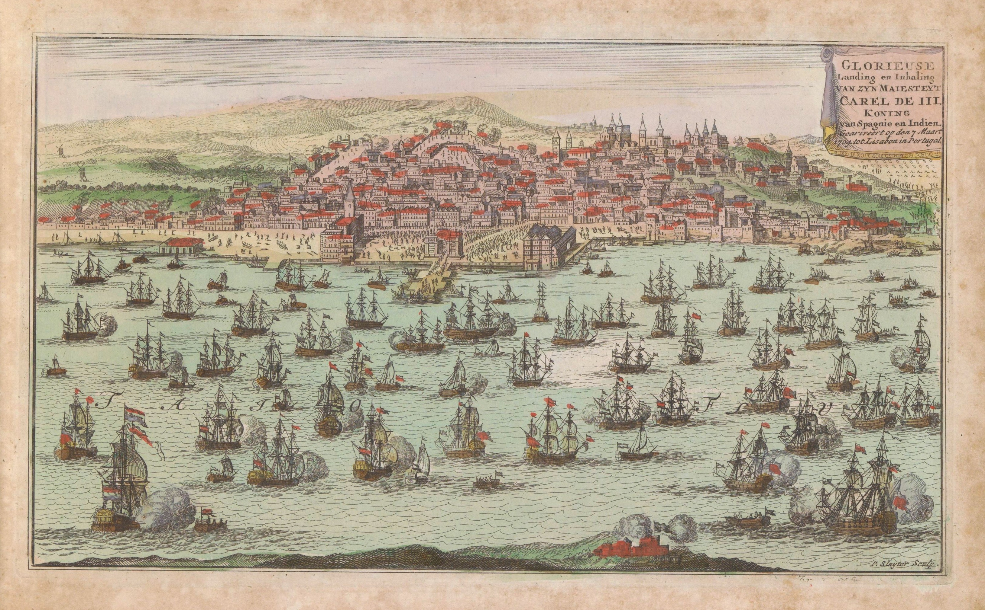 Karl fuhr mit seiner Entourage wieder nach Portsmouth zurück. Bald würden sie wieder in See stechen. Kurz darauf beruhigte sich das Winterwetter etwas. Vor Epiphanie begann die Weiterreise unter dem Geleitschutz der britischen Flotte. Ende Januar wurde das Schiff von einem Meeressturm überrascht und mit Mühe konnte die „Catherine Royal“ in einem Hafen ankern. Admiral Sir George Rooke ersuchte den Habsburger unter Deck zu bleiben. Aber Karl wollte nicht feige sein und mit seiner offiziellen Anwesenheit die Moral der Mannschaft tatkräftig unterstützen. Von Seekrankheit wurde nichts überliefert. Nach weiteren Aufenthalten in diversen Häfen kehrten alle Schiffe wieder nach Portsmouth zurück. Diese Hafenstadt an der Südküste Englands war ein historischer Eckpunkt. Hier startete die Meuterei auf der Bounty und die Eroberung der Normandie 1944 – aber das ist in diesem Thema doch zu weit gegriffen. Karl musste sich weiter in Geduld fassen. Erst im Februar 1704 konnte die Fahrt richtig losgehen.Ankunft in Portugal#