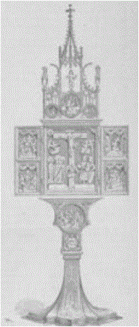 Der Altar zeichnet sich durch den filigranen kunstvollen Sinn seiner Ausführung aus und ist ein wahres Schmuckstück christlich-germanischer Kunst. Auf einem überaus graziösen Fußgestell ergibt sich ein Aufsatz, der in Form eines Tabernakels gebildet und beliebig oft geöffnet oder geschlossen werden kann. Das Innere zeigt das von Gruppen umgebene Bild des Gekreuzigten, die verschließbaren Flügeltürchen beherbergen auf ihrer Innenseite die heilige Geschichte. All das krönt ein emporstrebendes Spitztürmchen mit filigranen Verzierungen.