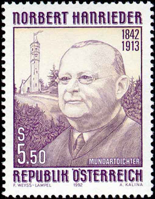 Norbert Hanrieder wurde am 2. Juli 1842 geboren. Seine musikalische Begabung und klangvolle Stimme führten ihn bereits im Alter von zehn Jahren als Sängerknaben in das Zisterzienserstift Wilhering. Nach dem Gymnasium trat er ins Linzer Priesterseminar ein, wurde 1866 zum Priester geweiht und als Kaplan nach Losenstein geschickt. Immer schon der Dichtkunst verbunden, bediente er sich in seinen Werken anfänglich der Hochsprache, um dann ausschließlich in Mundart zu schreiben. Seine erste Textsammlung "Bilder aus dem Volksleben des Mühlviertels" erschien 1895. Sein Hauptwerk "Der oberösterreichische Bauernkrieg", dessen Fertigstellung Hanrieder fast zwanzig Jahre seines Lebens beschäftigte, wurde in der Reihe "Aus da Hoamat" im Jahr 1907 veröffentlicht. Der Mundartdichter starb 1913.
