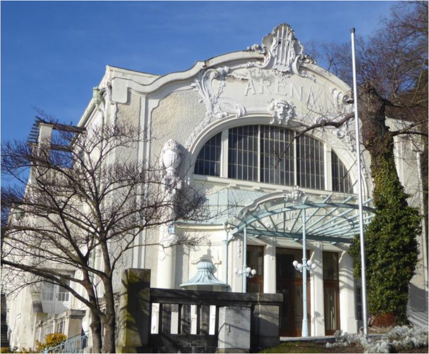 Nach Ende der Sommersaison 1905 war die liebe alte Dach lose Arena endgültig erledigt. Im Frühjahr 1906 konnte man bereits den modernen Bau aus Beton und Eisen, der nach den Plänen des Architekten Rudolf Kraus von Stadtbaumeister Franz Schmidt mit einem Kostenaufwand von 200.000 Kronen ausgeführt wurde, erstehen sehen und am 16. Juni nachmittags 4 Uhr fand in Anwesenheit des Statthalters Grafen Kielmannsegg, Bürgermeister Franz Trenner und Vizebürgermeister Brusatti von Baden, Bürgermeister Josef Trenner und Vizebürgermeister Gall von Weikersdorf, der Spitzen der Behörden und Vertreter der Wiener und der Ortspresse und vieler hervorragender Kurgäste die feierliche Eröffnung des neuen Musenheimes mit den verschiebbaren Glasdach, die erste Konstruktion dieser Art in der ganzen ehemaligen Monarchie, statt.