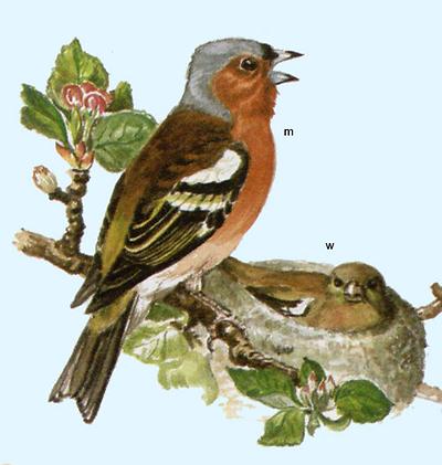 Brut: Das Nest wird kunstvoll in eine Astgabel gebaut und mit Moos und Flechten getarnt. Die 4-8 Eier sind blassblau mit charakteristischen „Brandflecken“; zwei Bruten jährlich.