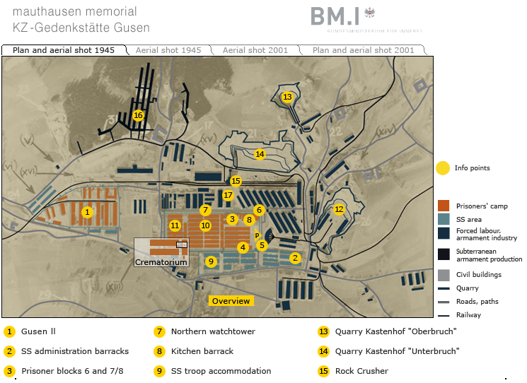 Als illustratives Beispiel für die Komplexität der NS-Vernichtungslager hier der Plan der Lager von Gusen, wo unter der Tarnbezeichnung "B8 Bergkristall" das erste praktisch einsetzbare Militär-Düsenflugzeug Messerschmitt ME 262 hergestellt wurde. Dazu Photos der Gedenkstätte, in deren Zentrum zwei Verbrennungsöfen stehen, in denen Leichen der durch die Zwangsarbeit und die unmenschliche Behandlung umgekommenen Opfer aus aller Herren Länder eingeäschert wurden (46.000 Tote!).