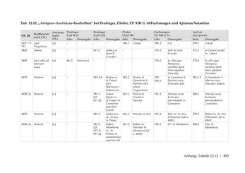 - Tab. 12.12: „Antiquus-Austriacus-Inschriften“ bei Peutinger, Choler, CP XIII G 14/Fuchsmagen und Apianus/Amantius 490