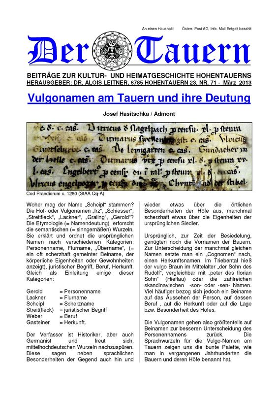 Vulgonamen am Tauern und ihre DeutungBand 71
